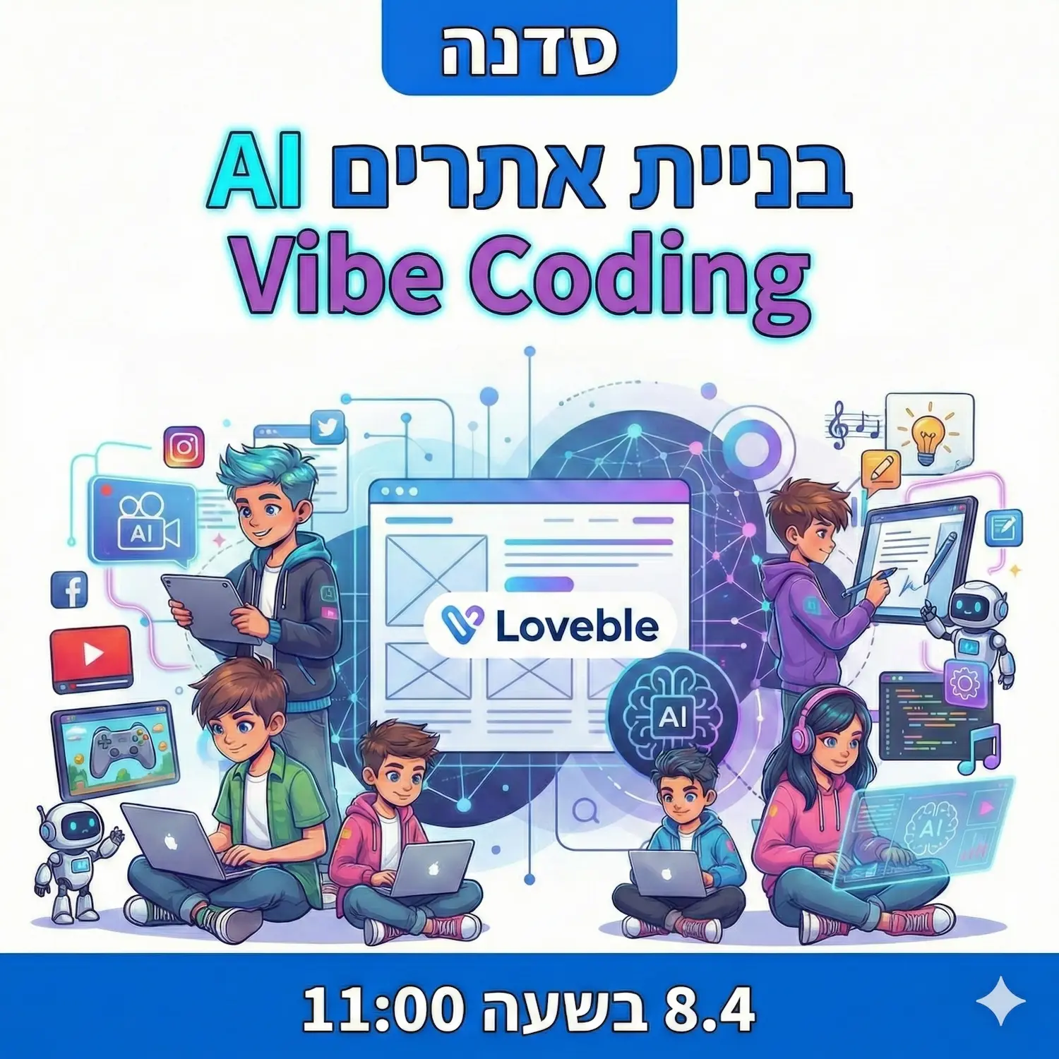הסדנה כוללת היכרות ידידותית, מודעת ואחראית עם כלי בינה מלאכותית, ומתקיימת בסביבת AI סגורה ומותאמת לילדים ונוער.